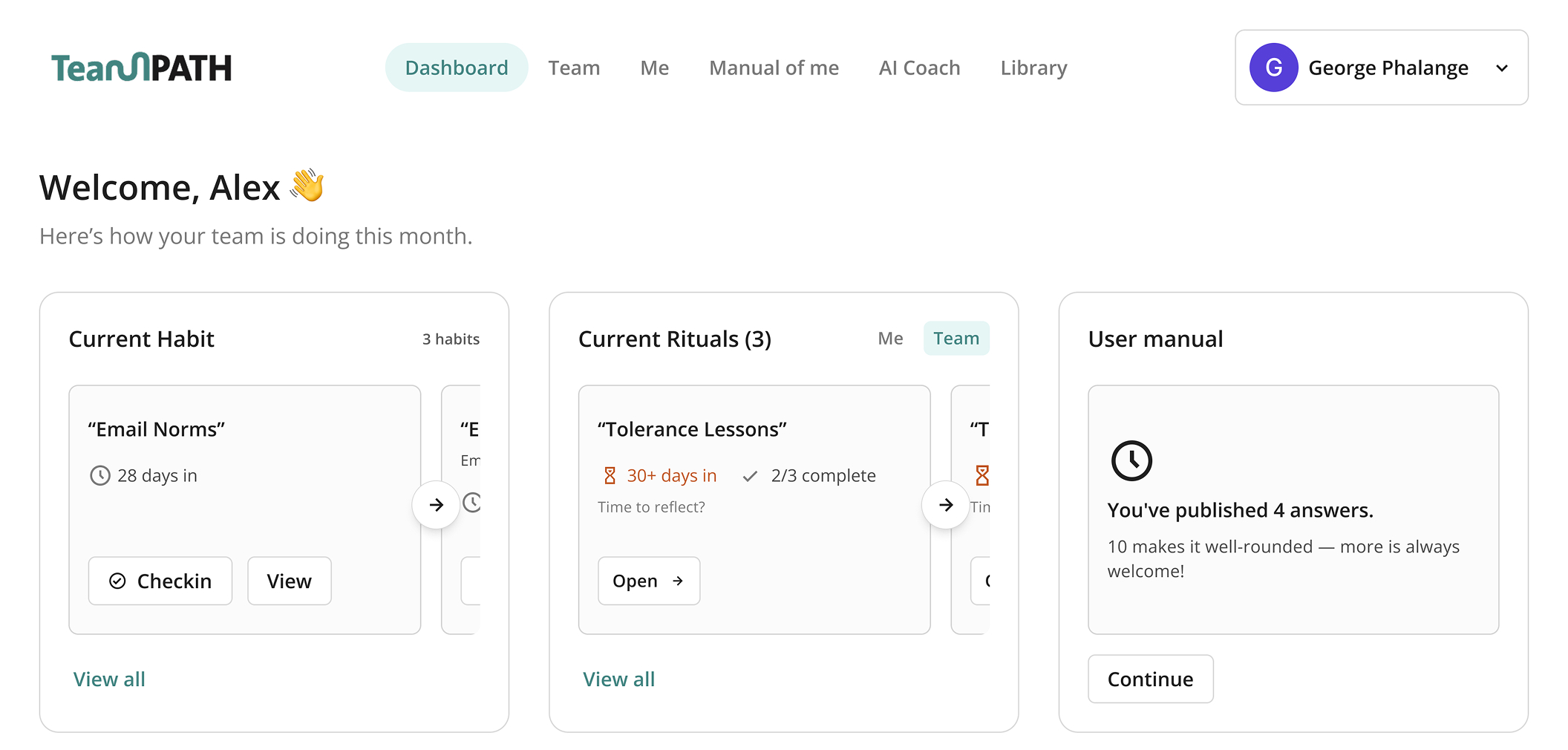 TeamPath helps teams build shared clarity on purpose, priorities, and ways of working — then embed it through simple habits and rituals. Built for remote and hybrid teams, and useful for any team that wants real alignment and better results.