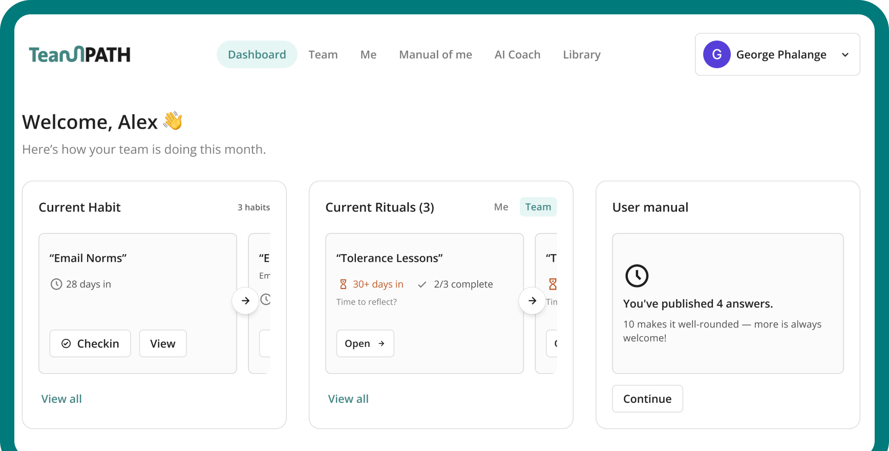 TeamPath helps partners and consultants turn programmes into sustained change by giving clients a simple structure to practise what they’ve learned — embedding habits, rituals, and reflection into everyday work.